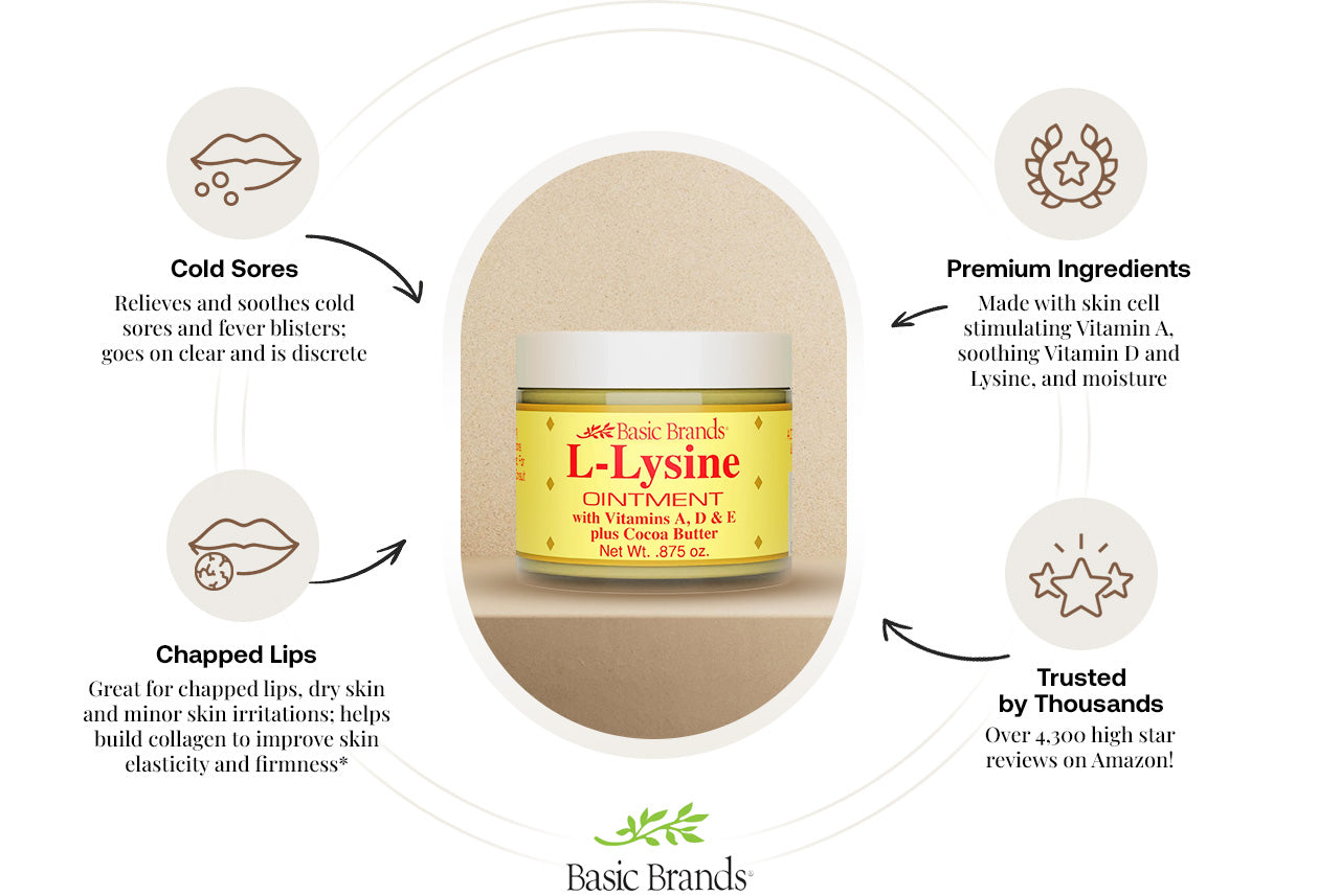 Basic Health Brands® L-Lysine Ointment combines innovation and expertise to deliver a powerful, multi-benefit solution for your skin. Enriched with Vitamins A, D, and E, this vitamin-rich ointment is designed to protect, heal, and rejuvenate. It provides effective relief for cold sores and minor skin irritations while creating a protective barrier to aid in healing.*